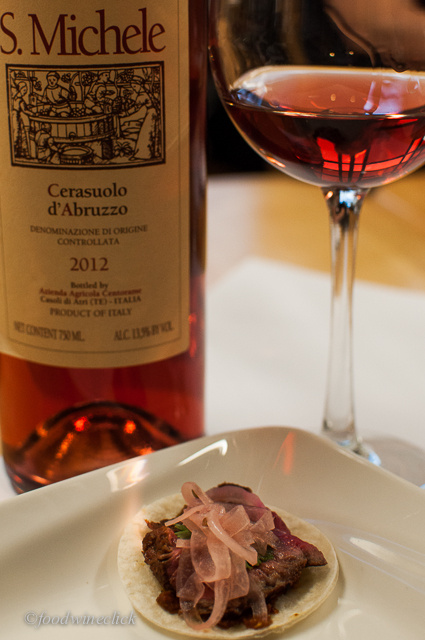 Spicy flatiron steak bite with a rich Saignée Rosé