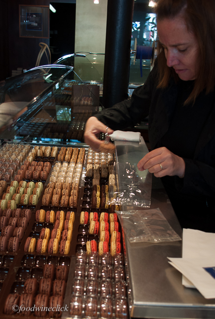 The macarons are carefully handled by special tongs