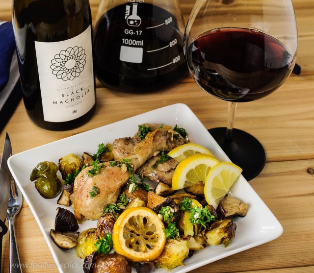 Pinot Noir is such a versatile wine with food, easily stretching from oven roasted chicken to grilled salmon, even to steak or roasted red meats. We paired our Black Magnolia with an easy 1 pan meal: Sheet Pan Chicken with Mushrooms and parsley sauce recipe from Food and Wine magazine, here. To make the meal truly 1 pan, I added red potatoes to the mix so we could have our protein, veggies and starch all in 1 pan, no kidding. True to form, the Black Magnolia paired beautifully with all the components of the dish, even the brussels sprouts tasted good with the wine.