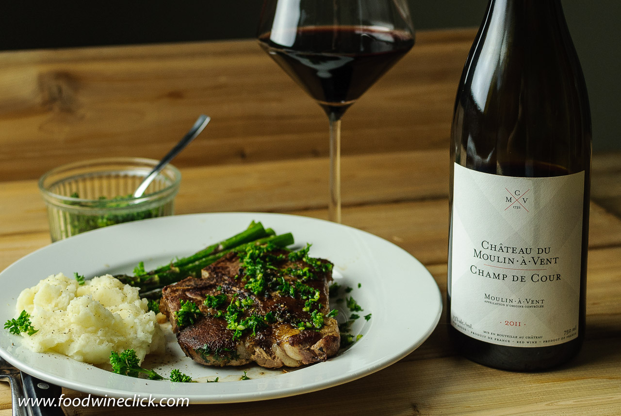 Pork chop with gremolata paired with Château du Moulin-à-Vent Champ de Cour