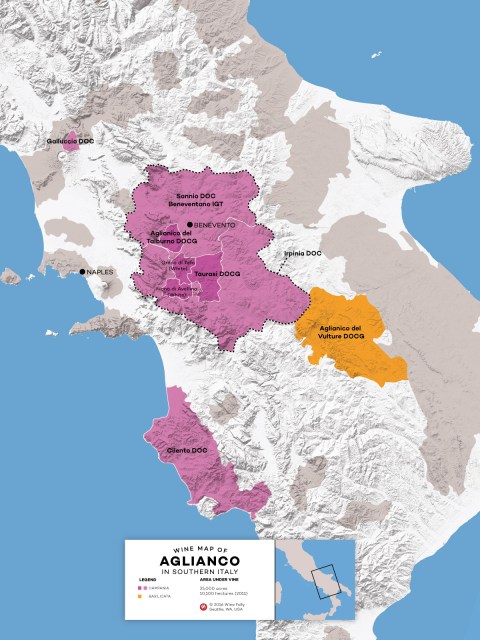Aglianico is found in Campania (lilac) and Basilicata (orange) Map courtesy of Wine Folly http://winefolly.com/review/understanding-aglianico-wine-italys-next-red/