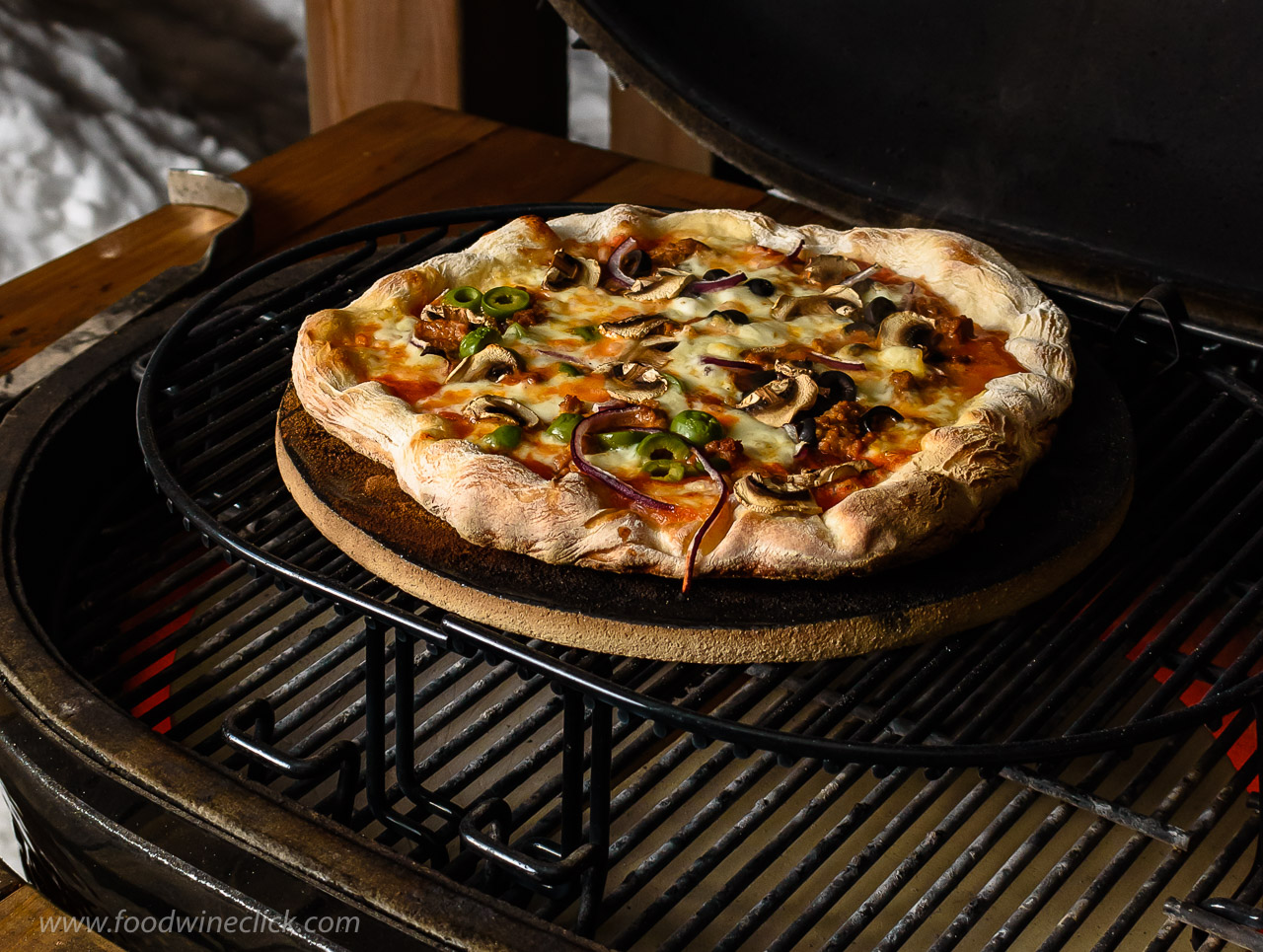 Tomato sauce, mozzarella, sausage, olives and a few other classic ingredients