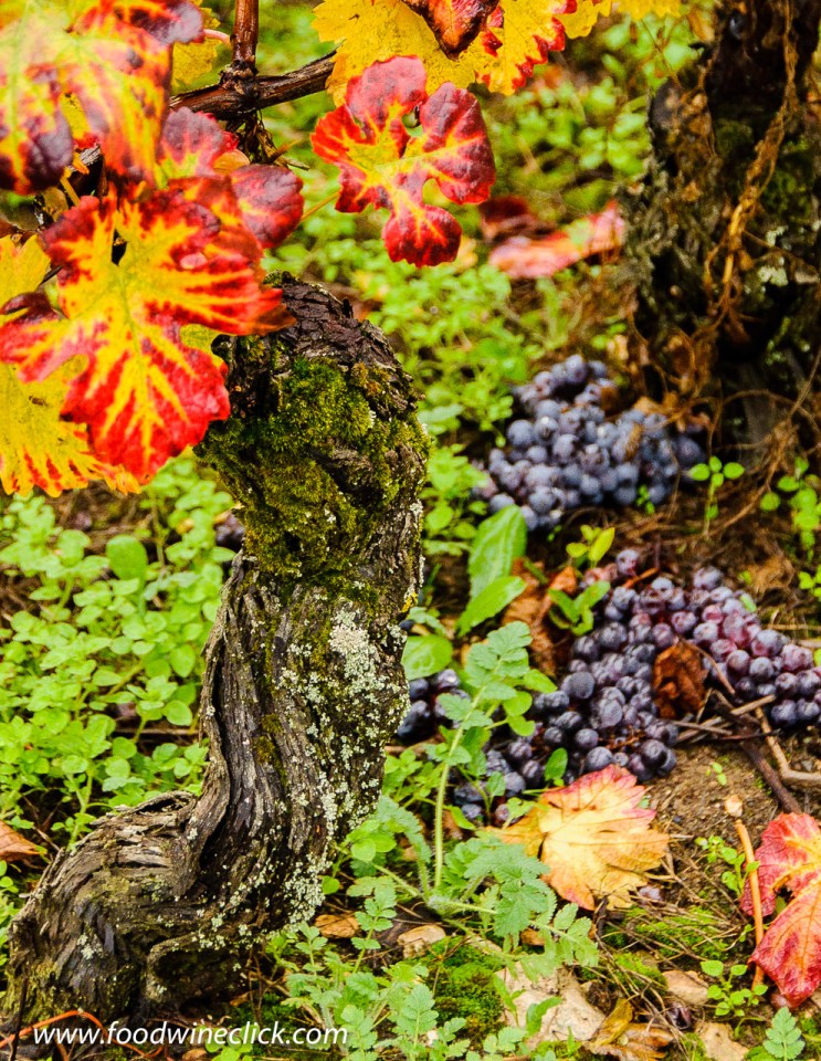 Old vines and green harvest grapes dropped to allow the remaining grapes to ripen fully