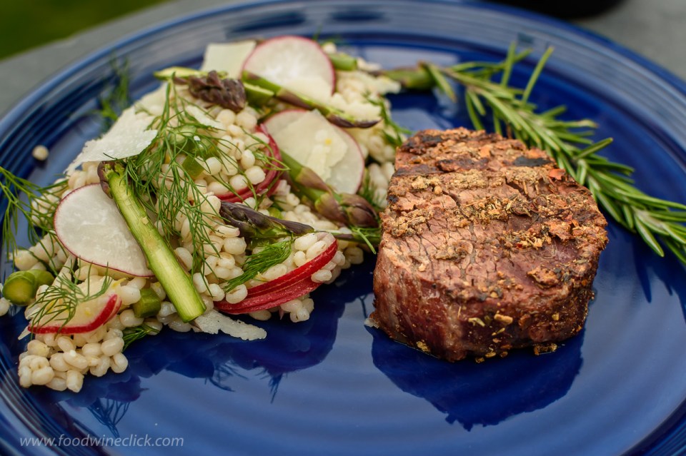 We tested two Côtes de Bordeaux wines with a porcini rubbed tenderloin with a barley/asparagus/radish salad
