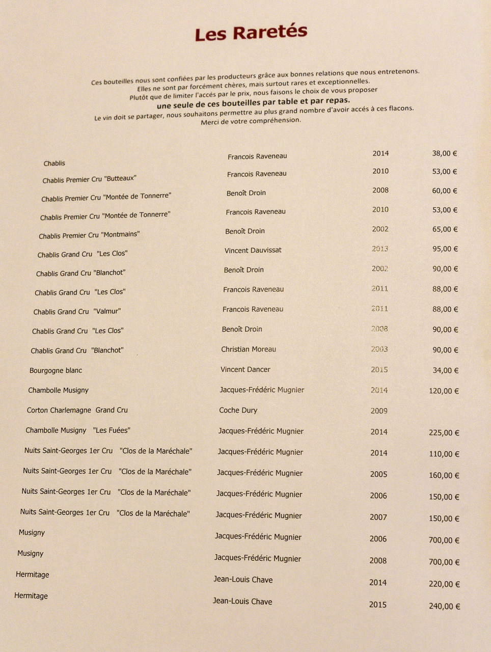 The most important advice of all! Find “Les Raretés” page on the wine list and order a bottle. Thank me later.