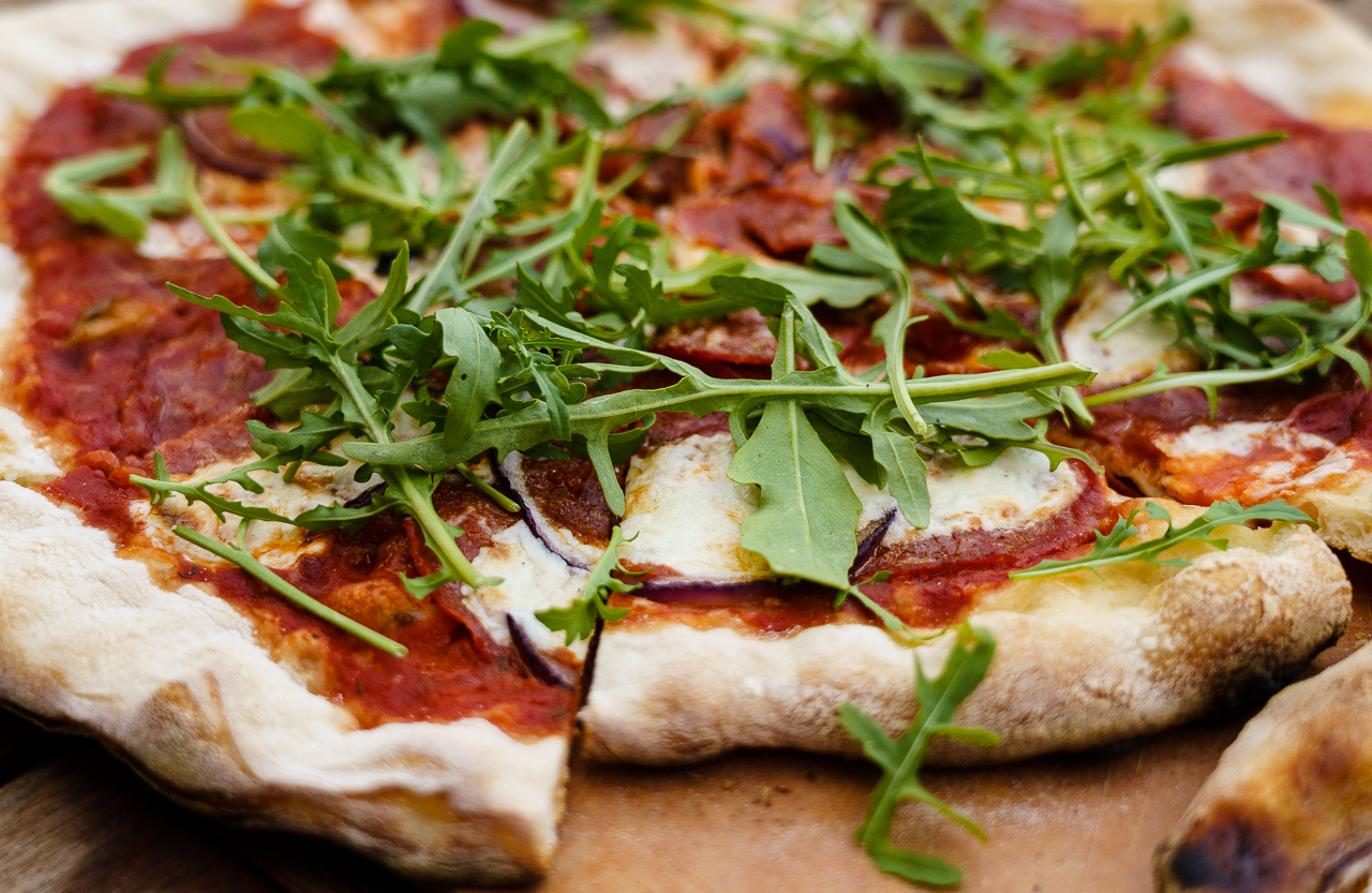 Traditional – red sauce, pepperoni, sausage, onion, and mozzarella. Top with arugula once out of the oven.