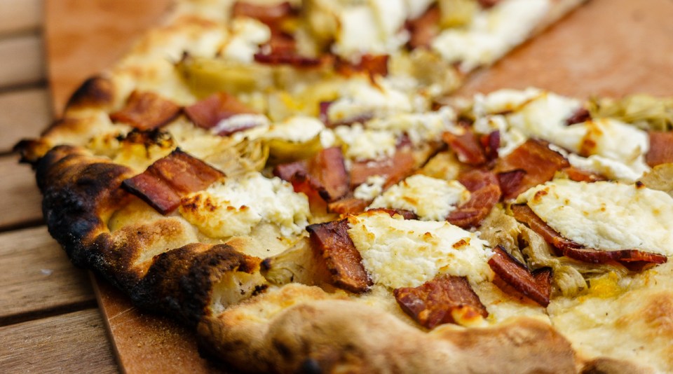 NotTraditional: Olive oil, bacon, artichoke hearts, lemon zest and goat cheese. Perfect with our skin-fermented Pinot Gris!