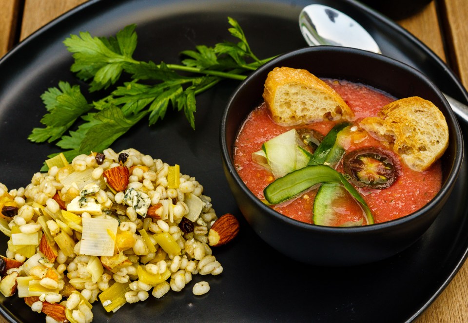On the left, a salad of farro, leeks, oranges and blue cheese. On the right, Patricia’s Gazpacho from José Andrés cookbook.