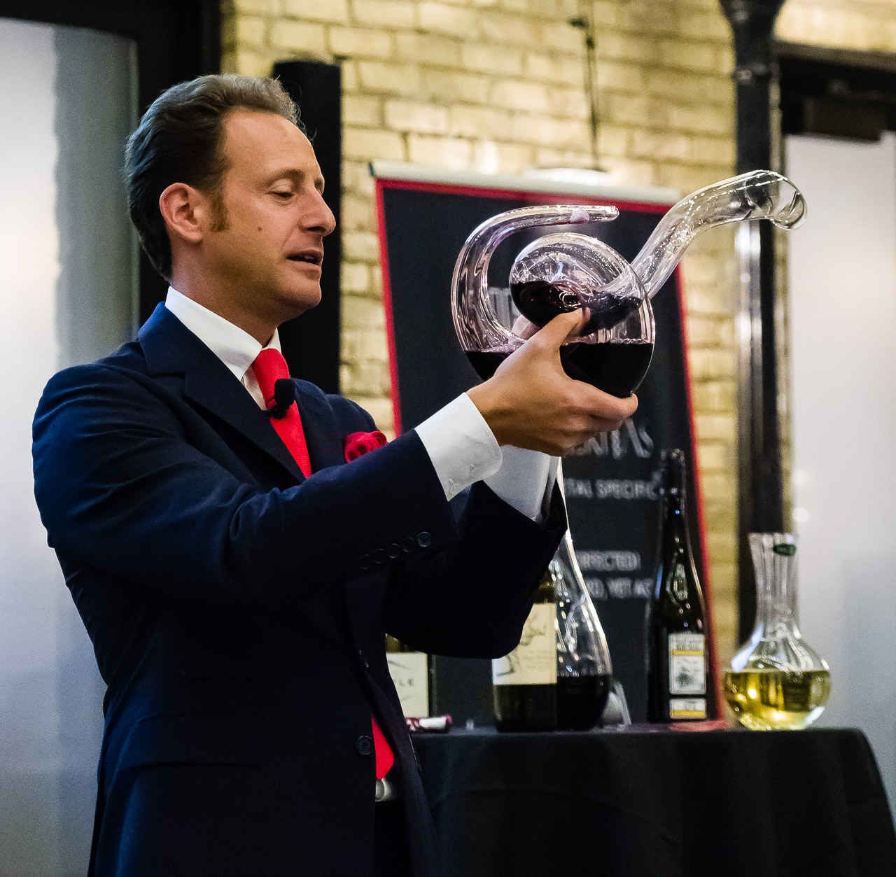 While it seems fanciful, it’s designed to pour out a single glass of wine as the sommelier rotates it to the pouring position. Ingenious!