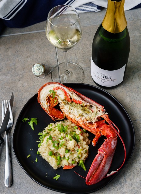 • To serve the lobsters, use a chef’s knife to cut the lobsters lengthwise in half, from stem to stern. Serve 1/2 lobster per person with a mound of lobster risotto. Cremant is a perfect accompaniment to an elegant dish you can make at home.