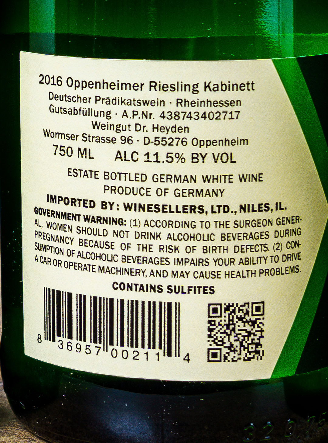 We see this wine is from the Rheinhessen Anbaugebiete. We can confirm it’s a Prädikatswein Kabinett. We see the alcohol is 11.5% abv, so we can see that “dry-style” will still have a bit of residual sugar.