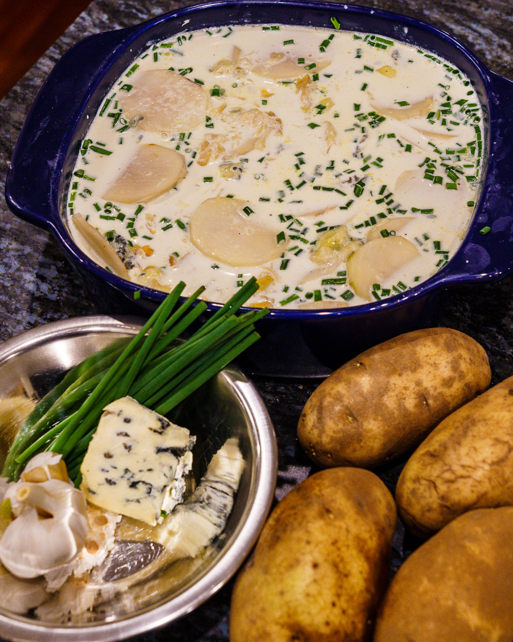 Not a weight-watchers approved recipe, the potatoes are loaded with cream, garlic and blue cheese. Delish!