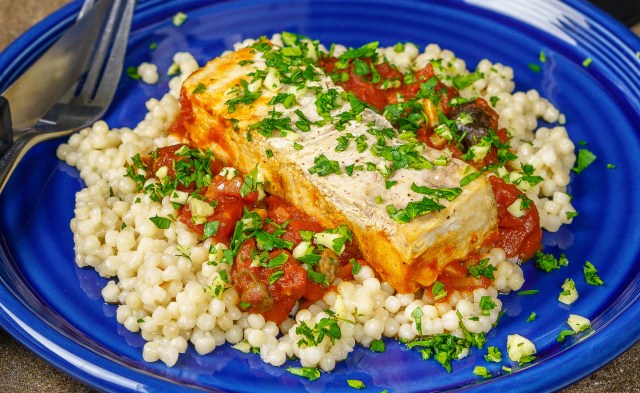 • Serve the sauce on the cous-cous, placing the swordfish on top, finally topping with the parsley-garlic mixture.
