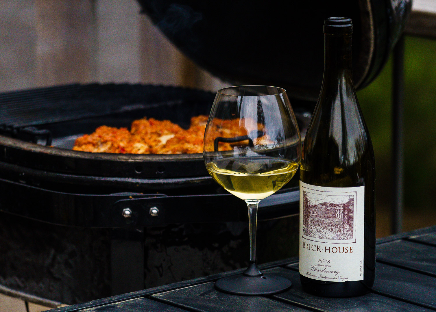 Enjpying a taste of Brick House Chardonnay while grilling the chicken for dinner