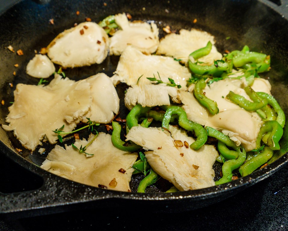 After the bread, saute the shallots, peppers and mushrooms