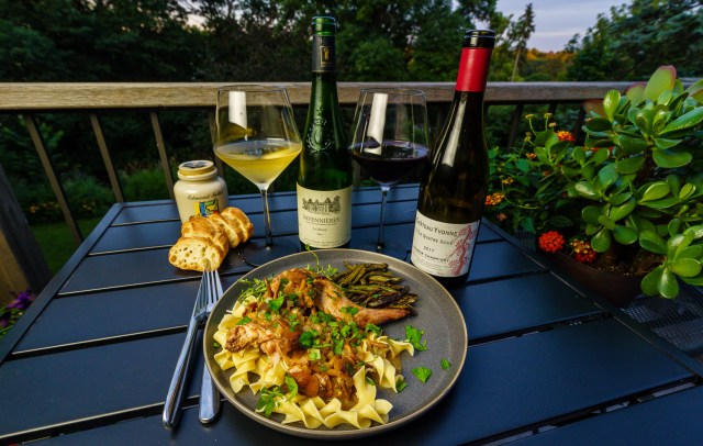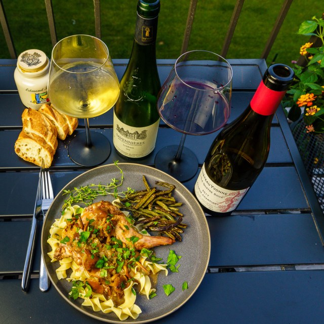 In the US, many people somehow equate eating rabbit with the Easter Bunny (I should know, I married one of those people). I equate rabbit with all the losses in our back yard bushes and trees over the winter, and the fact I need to protect my little herb and tomato garden like Fort Knox. I’m grateful those sentiments don’t seem to travel across the ocean, as rabbit is a typical dish one will find in France and Italy. Julie was in Chicago for a girls’ weekend, so I took the opportunity to make a ceramic grill version of rabbit with mushrooms and mustard. This dish pairs equally well with white wine and red wine from Anjou-Saumur!