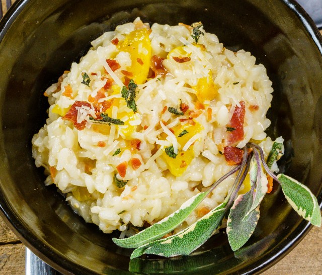 10. Gently fold in the squash, bacon and half of the sage.  Sprinkle the remaining sage on top of the plated risotto.