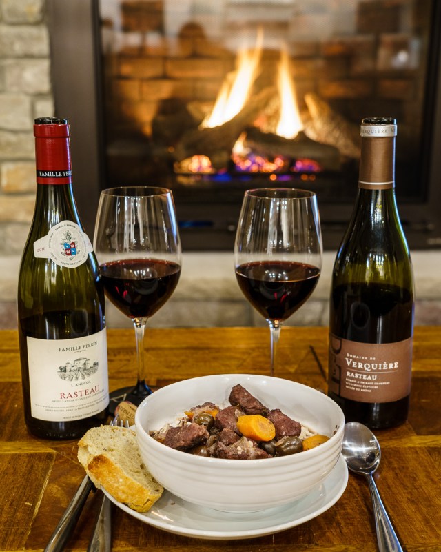 Delicious dinner by the fire with Rasteau wines and Gardiane la Camargue, a southern Rhone beef stew with black olives