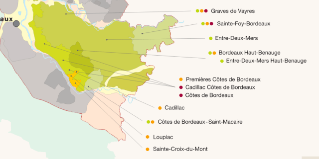 - Village Name – some villages only produce sweet wines, so the village name is your indication. There will likely not be any further sweetness indication. The most famous is Sauternes over on the left bank of the Garonne. The wines we feature today are all from the right bank, from the Entre-Duex-Mers, the region between the two “seas” of the Garonne and Dordogne rivers. Look for Cadillac, Loupiac, Saint Macaire, Sainte-Croix-du-Mont, Première Côtes de Bordeaux
