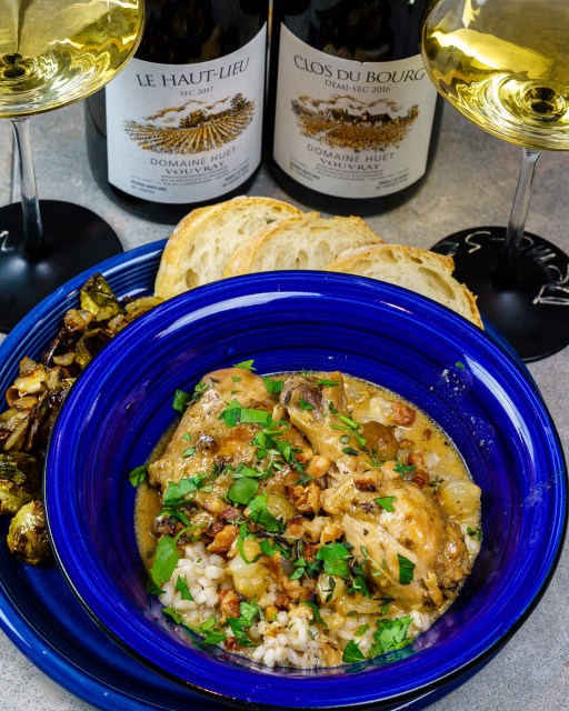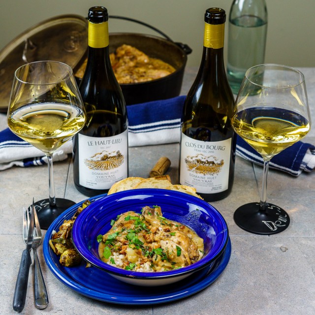 In researching potential food pairings with Vouvray, a repeated theme of “cream” surfaced. Fish in cream sauce, poultry in cream sauce, creamy desserts with sweet versions of Vouvray. I had both dry (sec) and off-dry (demi-sec) Vouvrays for my dinner pairing. I often struggle a bit with off-dry wines at the dinner table, this seemed like a good time to try a creamy dish. After a bit of searching through my stack of French cookbooks, a poultry in cream sauce recipe emerged. Voila!