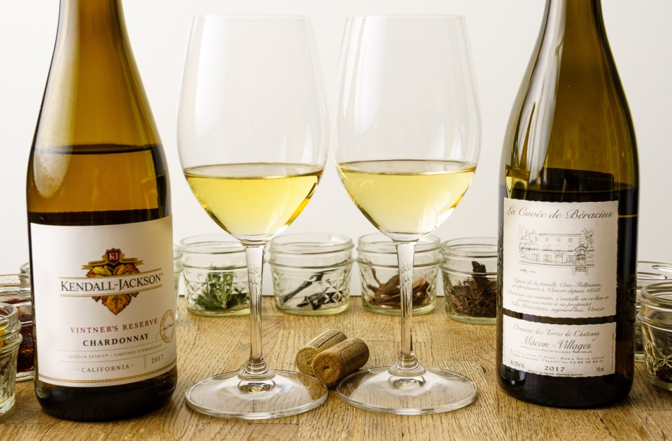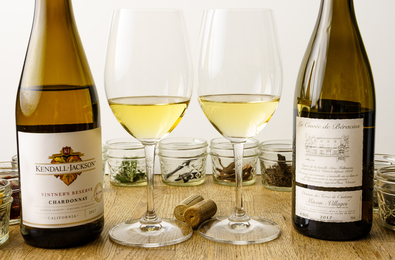 The Kendall Jackson Chardonnay is deeper in color than the Macon-Villages