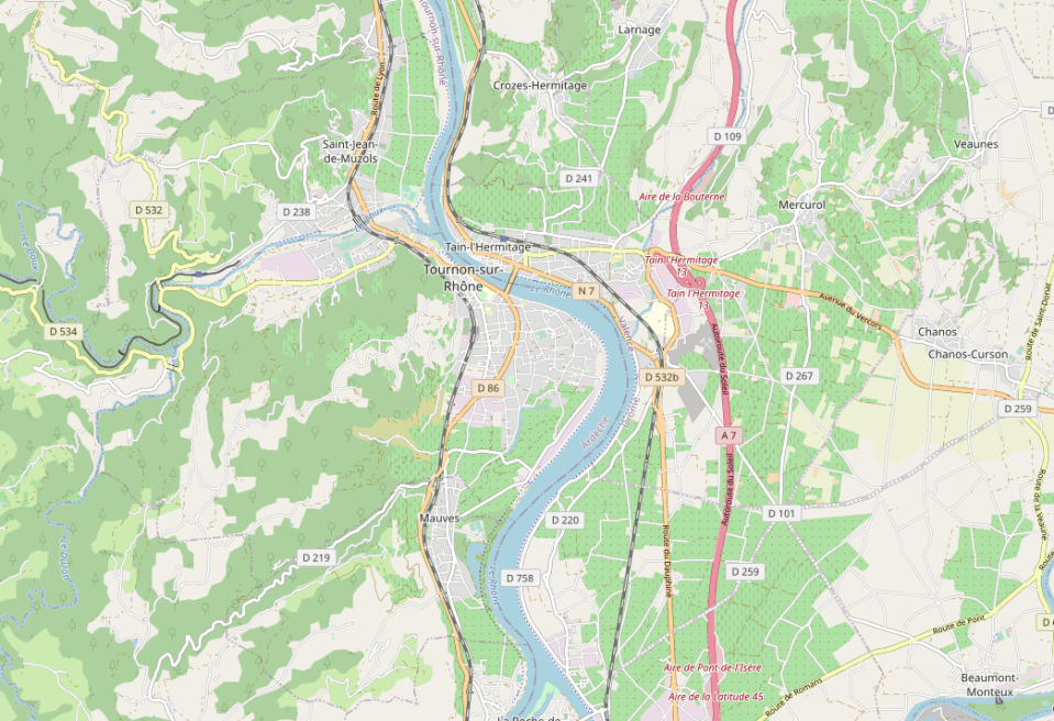 Find Tain l’Hermitage, Tournon, Mauves, Crozes-Hermitag. Map courtesy of freecountrymaps.com