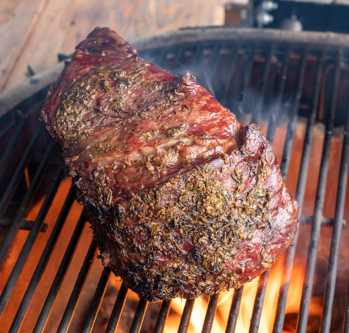 After a slow smoke at low temperature, the prime rib is seared just before serving
