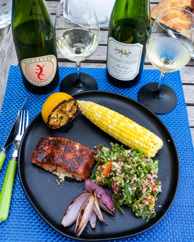 Red Newt Cellars Rieslings waiting for the salmon to finish