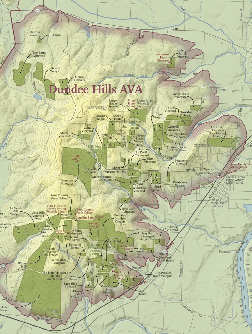 The print is small, but you can find many famous names among the wineries in the Dundee Hills AVA, including Sokol Blosser. map courtesy of oregonpinotnoirwine.com