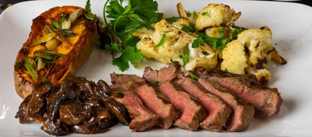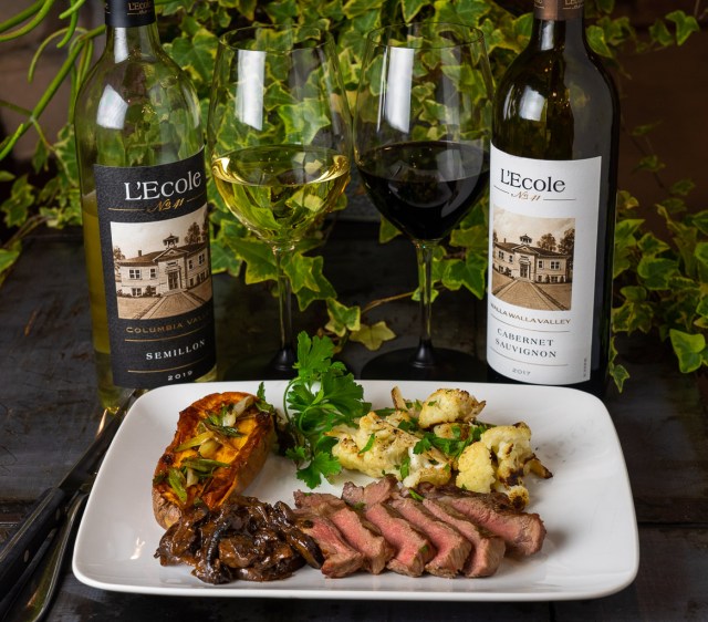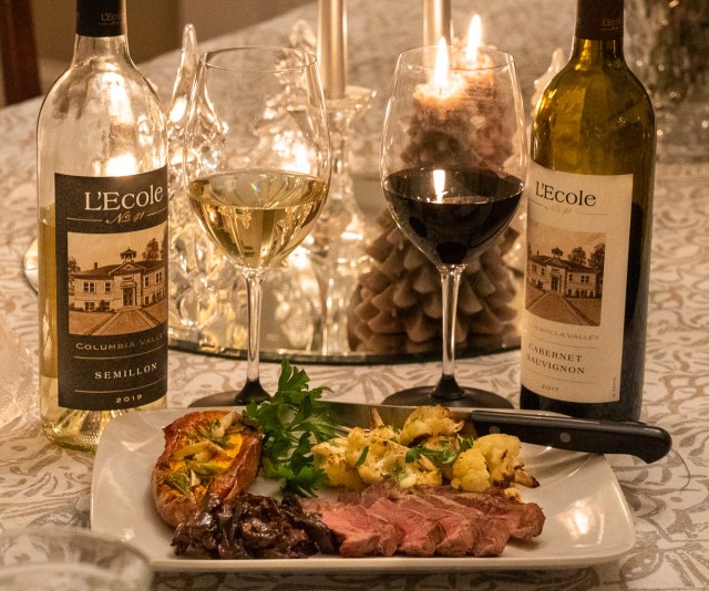 Dinner tonight was ribeye steak with sautéed mushrooms, twice roasted sweet potatoes topped with scallions and flaky salt (Bon Appetit recipe here), and roast cauliflower. Red wine would be a normal first thought for the best pairing, and I had a pair of samples from our friends at L’Ecole No. 41 in Walla Walla. As you can see, I poured glasses of each so I could give them both a try. As we enjoyed our meal, I found myself going back time and again to the Semillon. I never would have guessed beforehand, but it was the better of the two pairings.