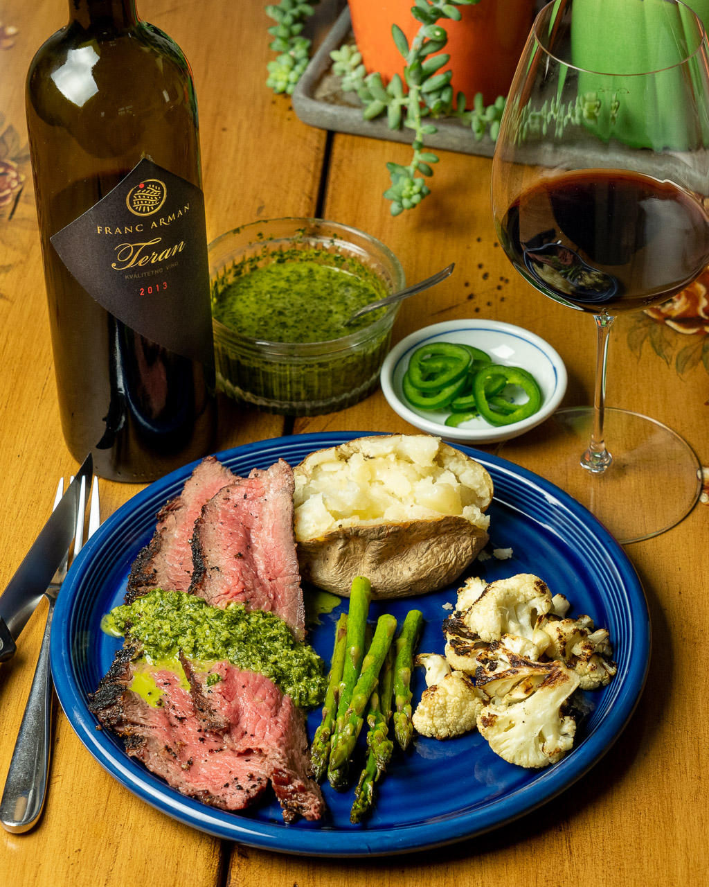 When trying a new red wine, I almost always default to some kind of steak, and with our coming spring weather, I could have fun cooking the whole meal on the grill. The salsa verde added just the right fresh kick of flavor to make us look forward to Minnesota greening up! The salsa verde recipe comes from our friends Mary and Sean‘s book Fire and Wine. Highly recommended for upping your grilling game! If you decide you want to really up your grilling game, I love my Primo Ceramic grill. Note – I don’t do affiliate links, I’m just a fan of these products.