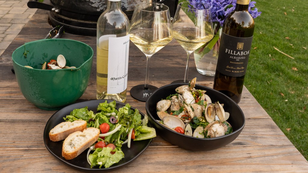 Albariño is the predominant grape making up the refreshing dry white wine which is the principal wine from the Rias Baixas region. We sampled three Albariños in our virtual press trip, and I feature two of them in our dinner of clams a la plancha below.