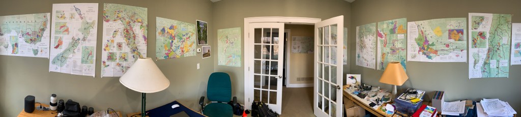 Diploma looks like being a graduate student. There are books and labs. Jeff prints off online classes, binds them and they are a key reference. Maps are also key resources; they cover the walls in our basement. Finally, he reinforces his learning by capturing information on all the wine regions in a very thick, hand-written journal. That is one full and impressive journal…again, remember he goes deep.