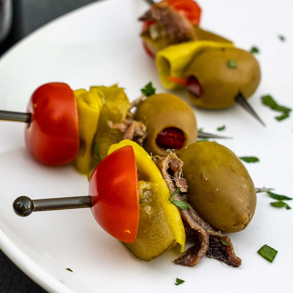 • Gilda – a classic cold pintxos, it’s named after a favorite character of Rita Hayworth. It’s just a little skewer of olives, anchovies, and pickles. My Minnesota version includes a cherry tomato, Julie’s homemade pickle, anchovy, little pepperoncini, and an olive. I was a bit worried about the anchovy, but these were a universal hit!