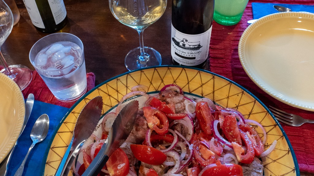 We substituted pork tenderloin for the chicken called for in a Food & Wine magazine recipe featuring marinated tomatoes and red onions, here. This dish was another surprise hit, and the Gewürztraminer was a perfect complement, offering its own set of aromas to balance the garlic in the food.