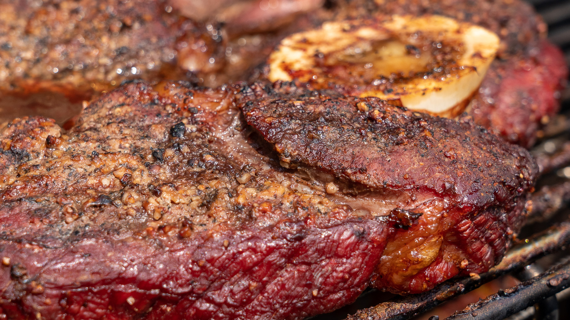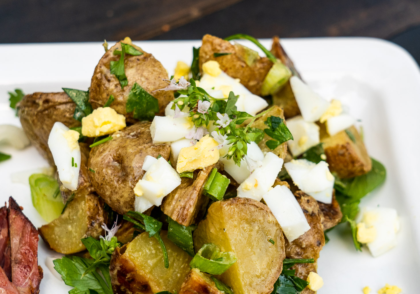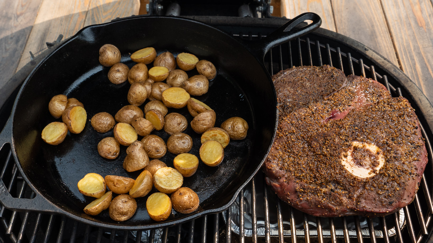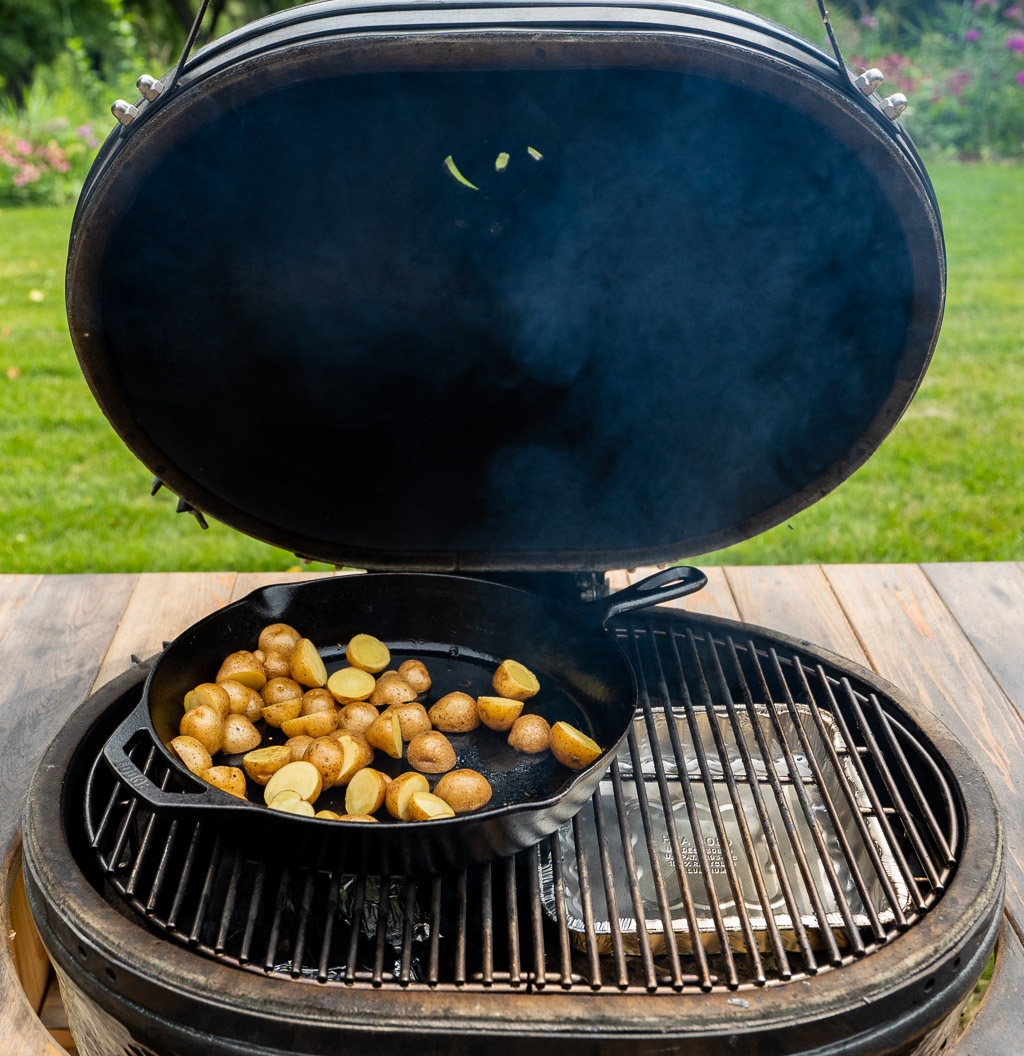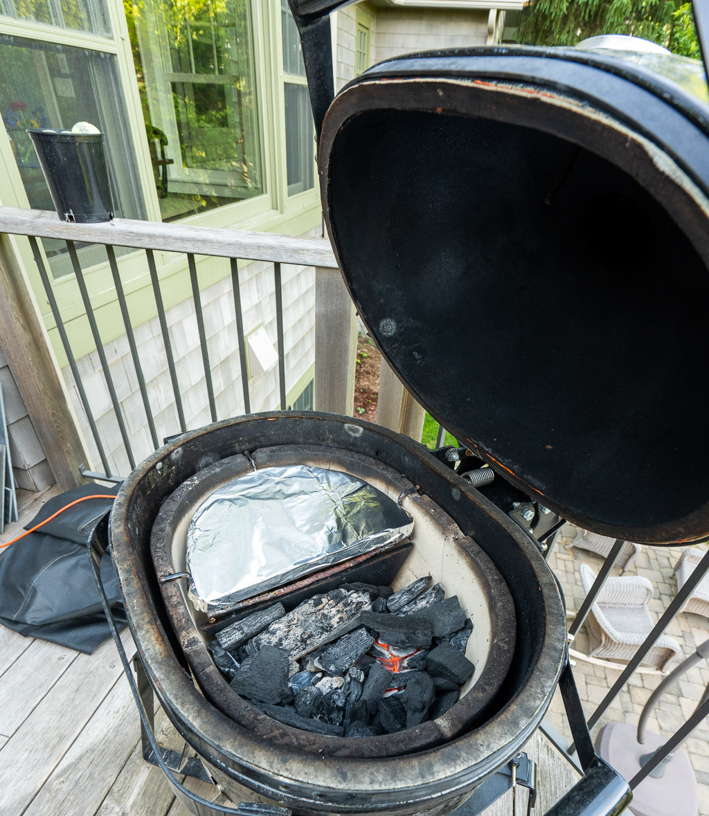 I set up my grill for split direct/indirect heating. This includes coals on 1/2 of the bottom of the grill, with a ceramic plate on the non-coals side to offer lower temperature and indirect heat. I included a couple of foil wrapped applewood chunks to create smoke. After starting, I adjusted the grill for a 300-350°F dome temperature. Baby yukon gold potatoes were smoked in a cast iron pan for about 30 minutes, then removed. Once the potatoes were going, I added the chuck roast. The roast had been rubbed with a beef rub from our friends Mary and Sean at Vindulge. The smoked potato salad came from a recipe from Amy Glaze, who I found on Instagram. She’s a creative chef and a skilled photographer!