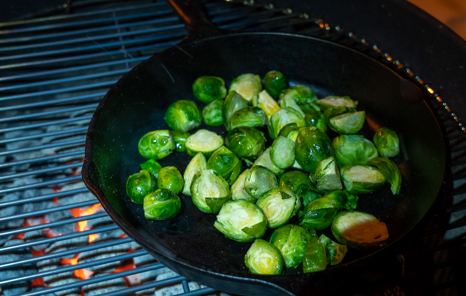 With the snow having started, we kept the grilling super simple. Nothing more than roasting brussels sprouts in a cast iron skillet and quick searing a steak. We cooked the steak fries in the oven indoors and prepared the topping for the brussels sprouts. We loved the brussels sprouts in saor recipe from NY Times Cooking Thanksgiving and it has become our go-to recipe for topping sprouts.