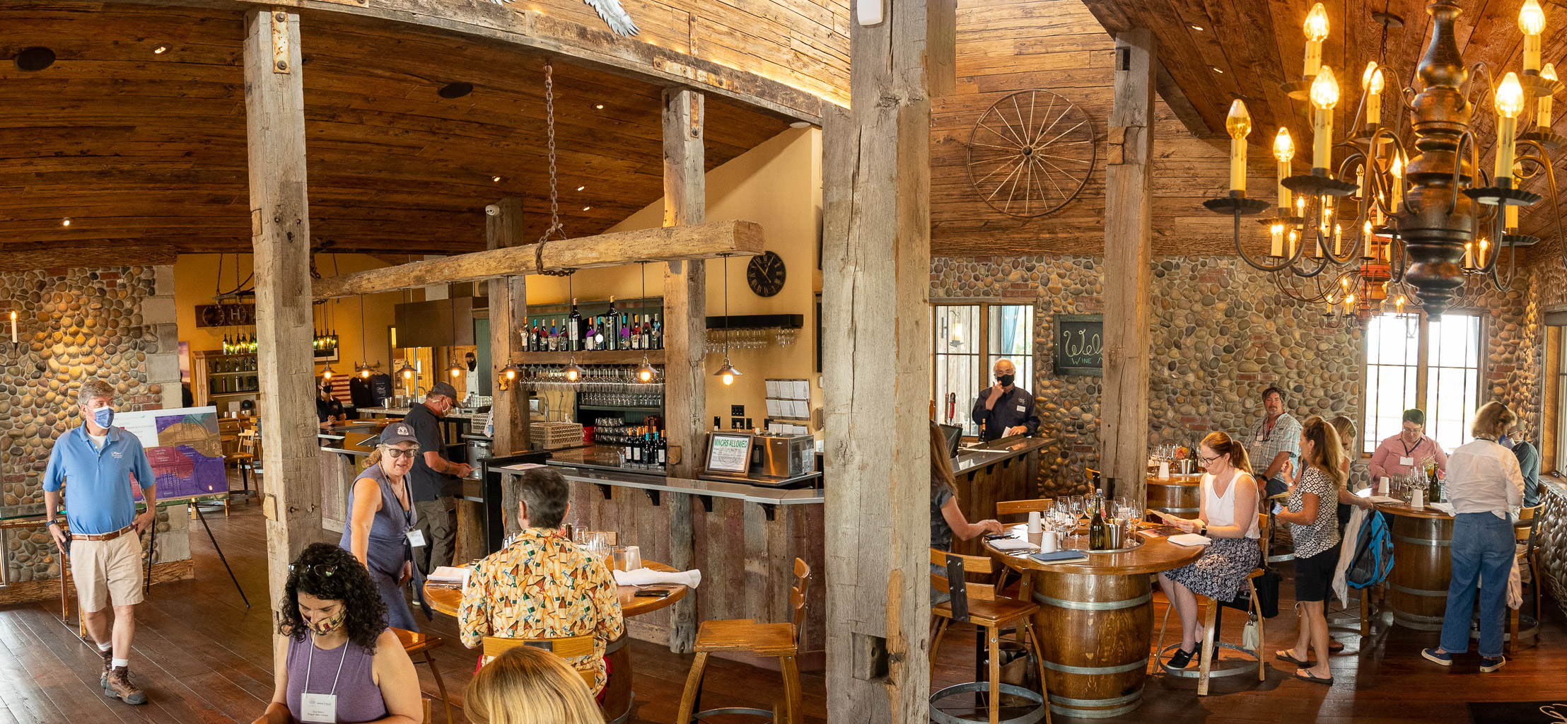 The 2Hawk tasting room is likewise built with sustainability in mind. The materials used in construction are all recycled. The stones in the walls all come from the property, the timbers, flooring and ceiling are all recycled. The trim comes from grapevine cuttings in the vineyard. Even the barstools and tables are upcycled from old barrels.