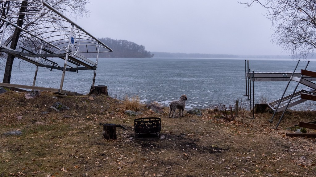 I needed to run up to the lake for a few chores, and since it was just Otto and me, dinner was my choice. We’re having a pretty miserable cold, wet spring in Minnesota. It’s rare to still have ice on the lake at the end of April.