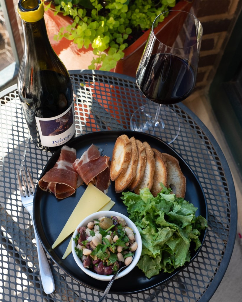 We were looking for a light dinner on a beautiful spring Sunday afternoon, and we hit upon a White Bean Tapenade recipe from Bon Appetit. For fun, I served the tapenade in deconstructed fashion so we could mix and match a slice of serrano ham, pleasant ridge reserve cheese, or the white bean tapanade on our toasts. A side salad of simple greens with mustard vinaigrette finished the plate. The Pélroge L’Astré was a nice partner to the food with refreshing acidity, nice fruit and herbs. A delicious and relaxing end to the weekend!