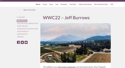 Jancis Robinson Wine Writing Competition 2022Jancis’ annual wine writing competition in 2022 challenged wine writers to consider the topic of Regeneration as related to wine. My article highlighting Regeneration at Troon Vineyard was posted on Jancis’ site today! Troon Vineyard and Regenerative AgricultureAgriculture is a major contributor to climate change and our modern farming techniques … Continue reading