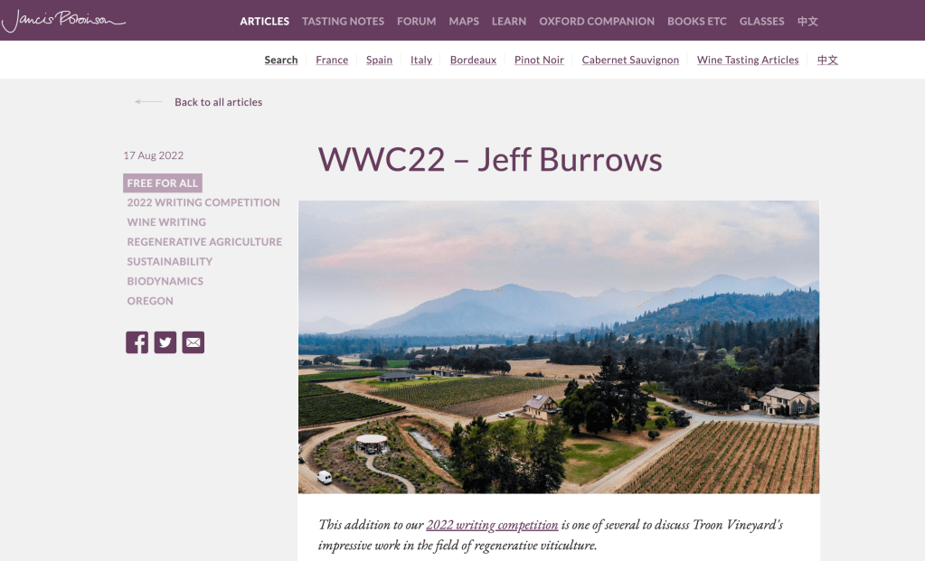Jancis’ annual wine writing competition in 2022 challenged wine writers to consider the topic of Regeneration as related to wine. My article highlighting Regeneration at Troon Vineyard was posted on Jancis’ site today!