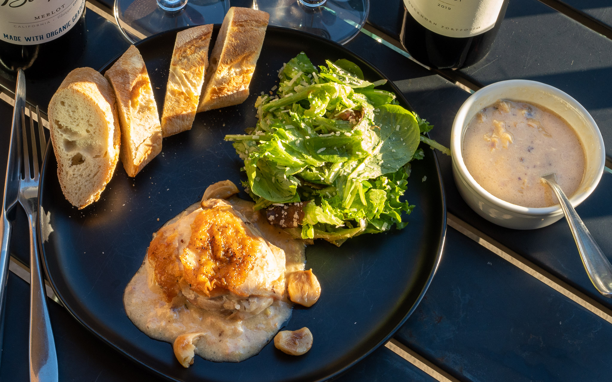 40 cloves chicken is a classic recipe, widely available online. I used a recipe from ATK’s Modern Bistro cookbook, but here’s another classic version available online James Beard NYT cooking. Don’t be put off by the garlic, it mellows wonderfully in cooking and becomes a delicious spread for your crusty baguette. Merlot might not occur on first thought as a chicken pairing, but the rich garlicy sauce provides plenty of richness and depth to pair with the bigger body of a California Merlot. Wine and winery details follow below.