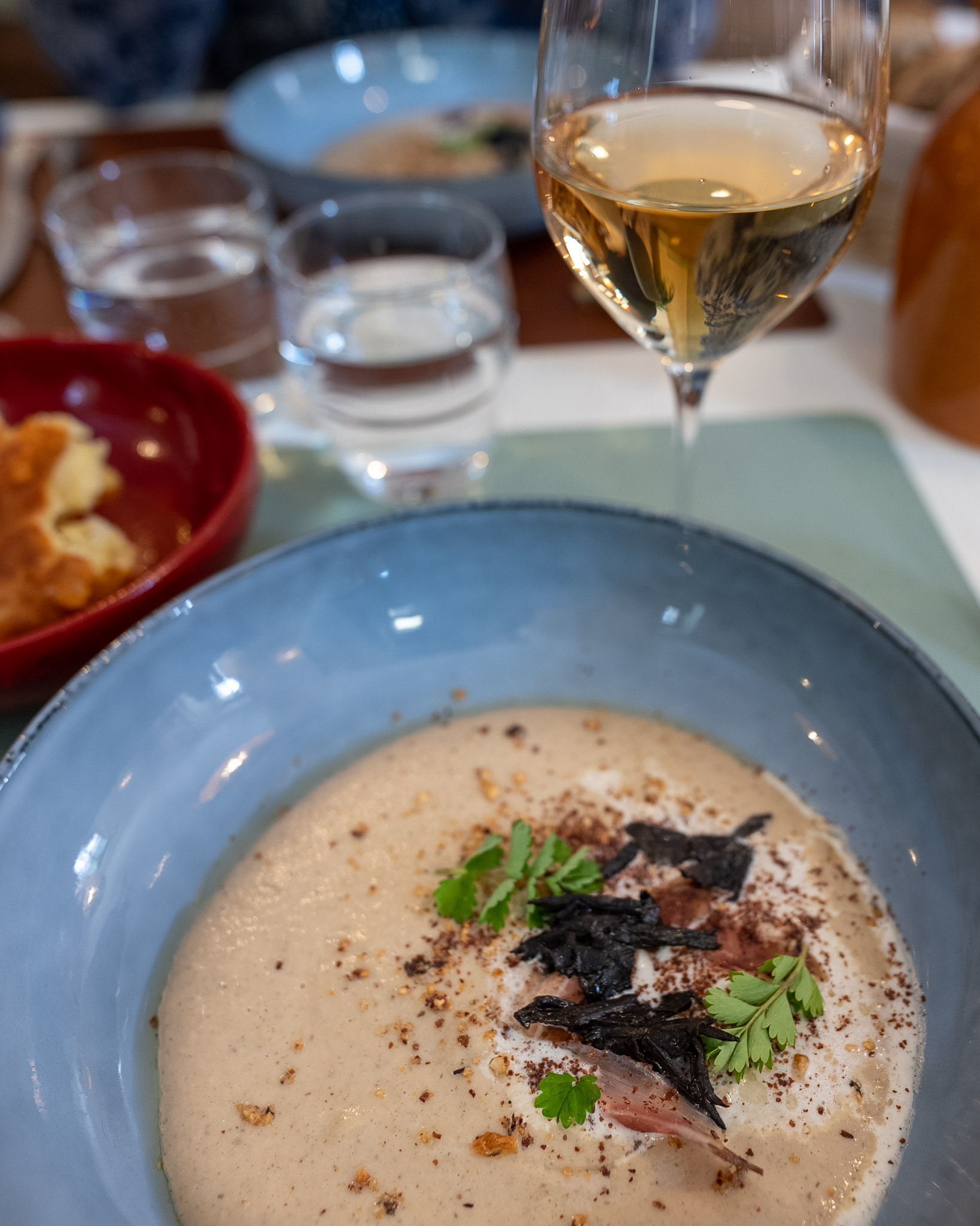 Bistrot Des Falaises is a relatively new restaurant in the commune of Saint Romain, a pretty little town off the beaten track in the Côte de Beaune. It sits in an area surrounded by cliffs (falaises) up in the hills behind Meursault. In the fall the colors of the woods and vines are beautiful on a sunny day.