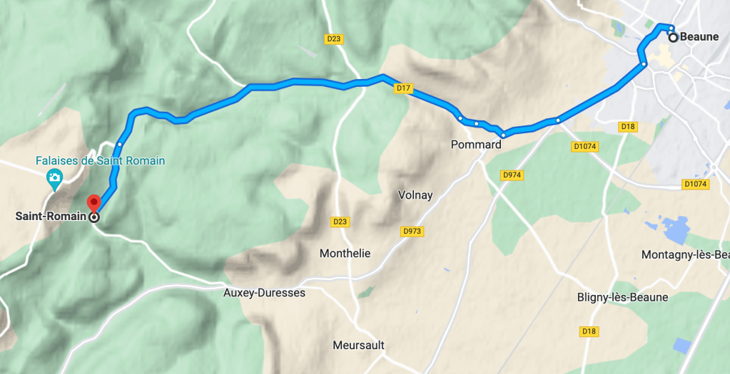 There are two ways to get from Beaune to Saint Romain: one is relatively flat, paved roads or shorter (1 minute quicker) single lane gravel/paved paths through the vineyards. Choice number two twists up & down with blind corners edged by stone walls. There are great views in the vineyards unless your partner suffers from carsickness….