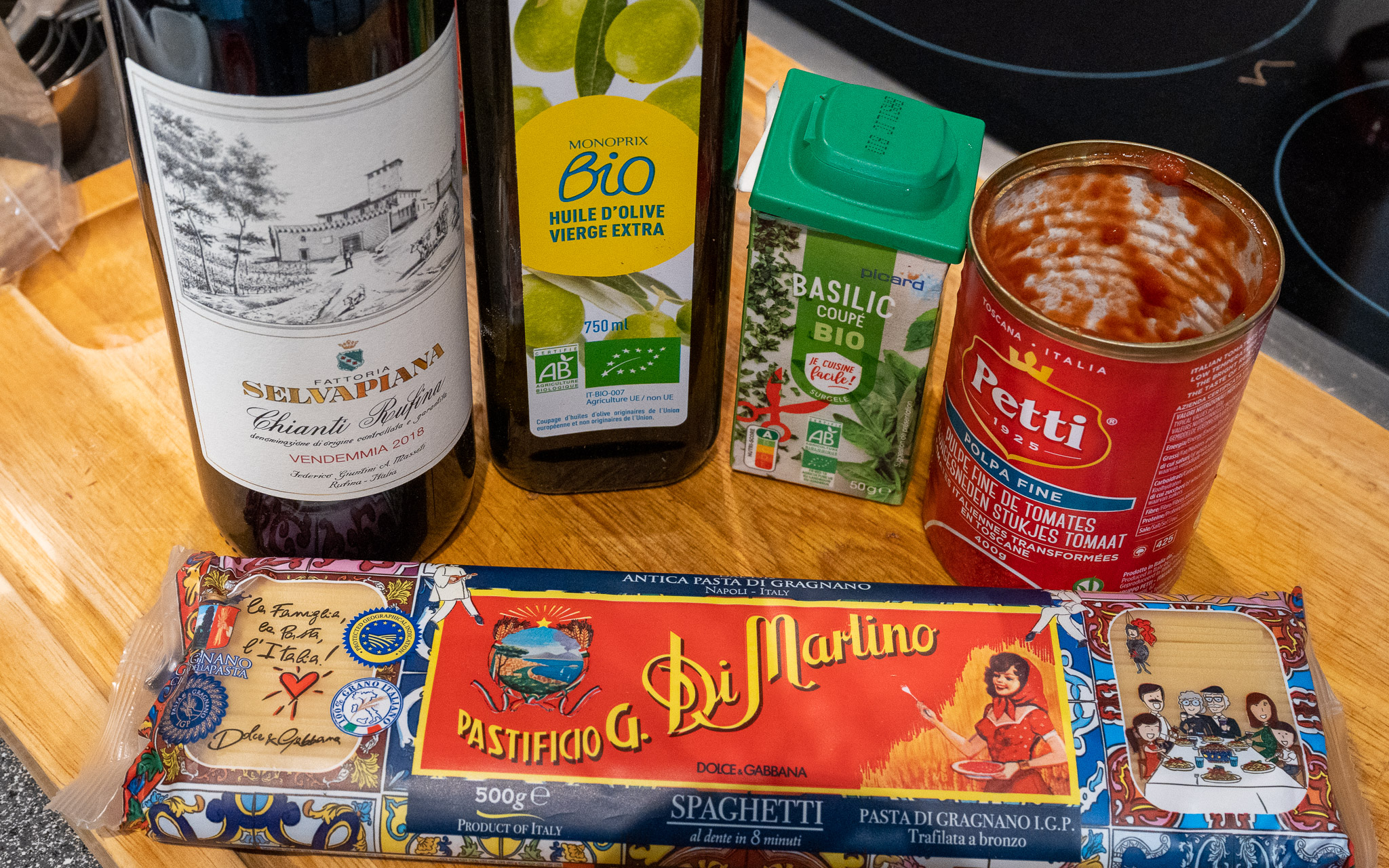 We’re camped out in Dijon, France this fall so it’s a miracle I’m able to participate. Most wine shop employees would look at you quizzically if you asked for a bottle of Italian wine. “They make wine in Italy?? Never heard of it. How about this nice Bourgogne Rouge.” Luckily, I ran across one of my favorite Chiantis earlier in the month and I was excited to join the Chianti celebration. We’re in an AirBnB which is always a fun challenge in the cooking department. Luckily, our kitchen is well equipped and all I needed to do was figure out the French names for ingredients in my fully American make-anywhere spaghetti. Like every good meal, it starts with sautéing chopped onions and garlic (ail at the marché). One of the challenges at a French marché, all the fresh ingredients are local and this is late in the season for fresh basil (basilic). I found some fresh frozen at Picard, the frozen foods shop. Tomato sauce is pretty easy to find. I was happy to see decent Italian pasta, real semolina and slowly formed through brass die, this makes for a rough texture in the pasta surface, perfect for holding the sauce. Add some sautéed meat if you like, and sautéed local mushrooms (from the mushroom farmer!). Throw in a few olives if you like. Somehow this dish just tastes better with Italian wine and Chianti Rufina perfectly fits that bill.