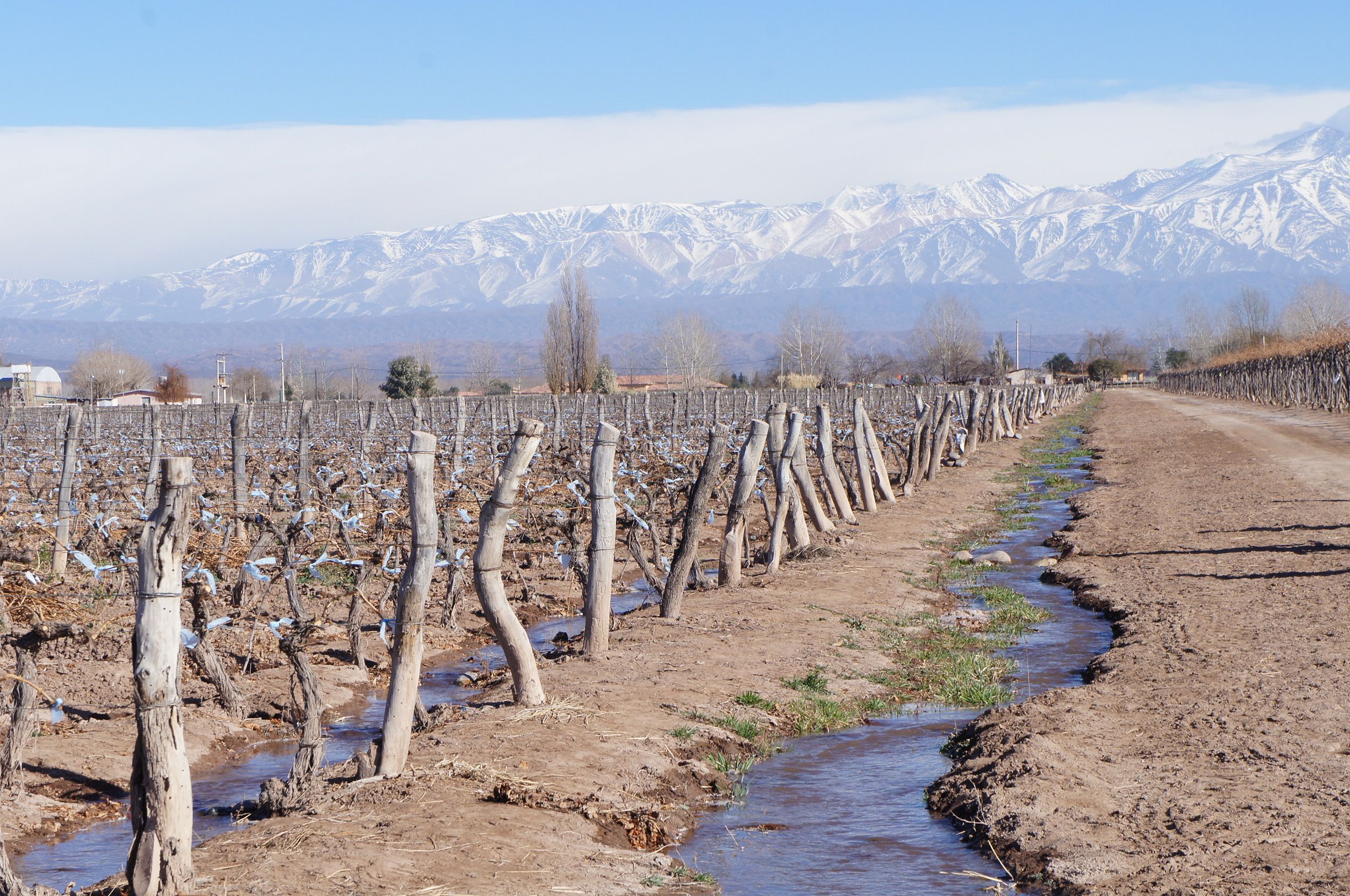 The Andes mountains create a large rain shadow in Argentina. The dry conditions are good for reducing vine diseases, however, irrigation is needed. Traditionally, vines were irrigated using flood irrigation from spring snowmelt. However, this requires vineyard placement on level or minimally sloped ground. Over time, Argentine growers found improved irrigation techniques allowing vineyard development on slopes which favor higher grape development.