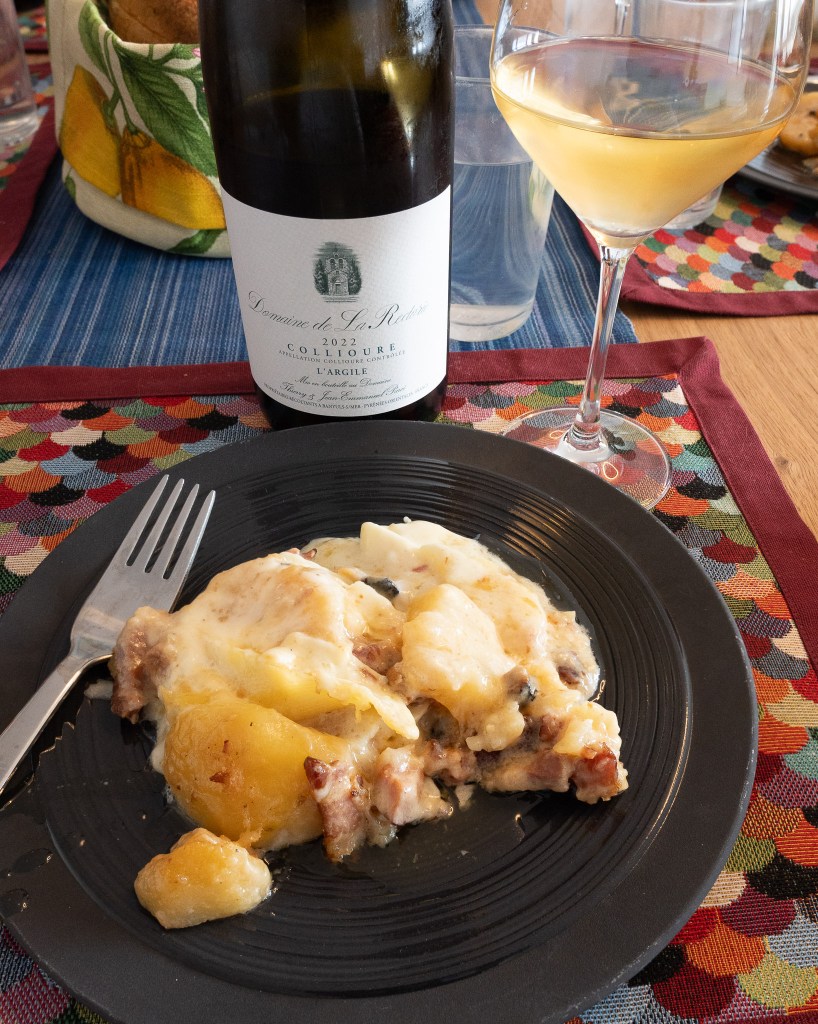 Perfection! Rich, gooey tartiflette paired with a crisp white wine – yes, please.