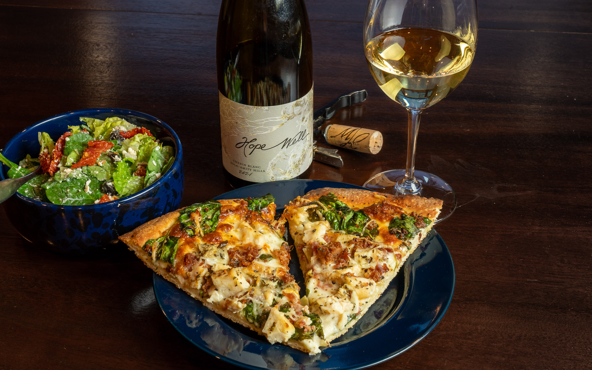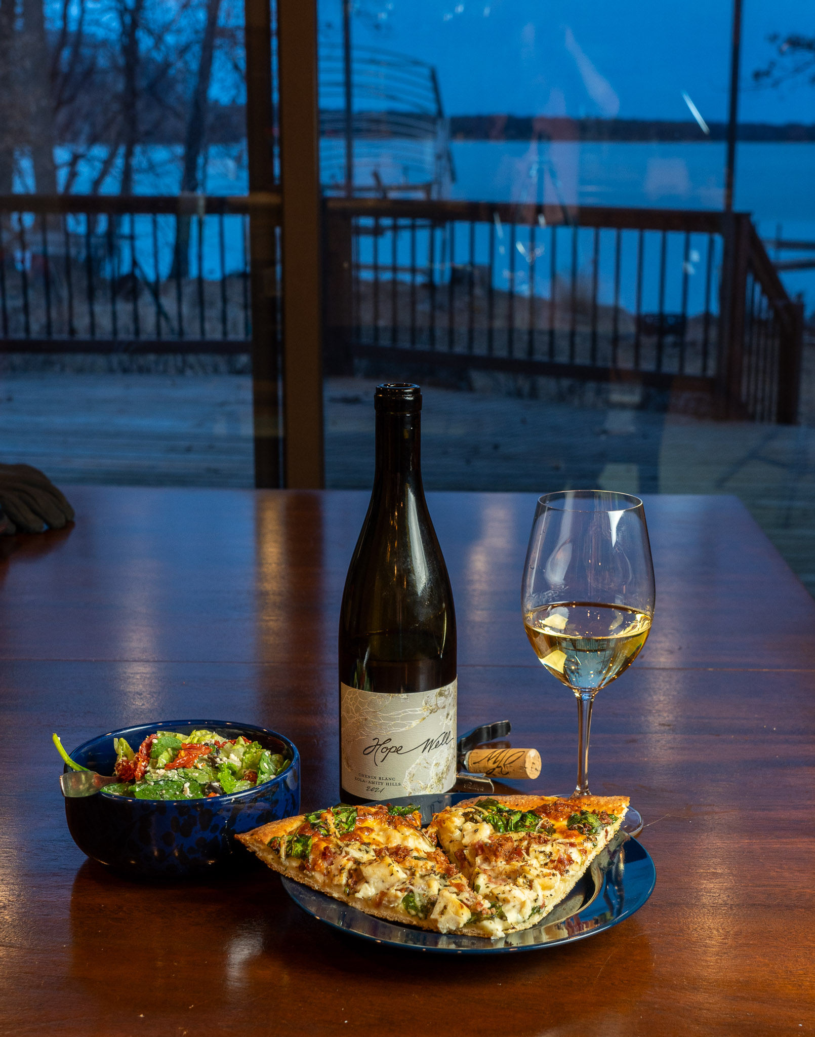 We co-own a cabin a couple hours north of Minneapolis. Spring and fall are our seasons for doing chores, making improvements, fixing whatever is broken; there might be some fun had along the way. I particularly love the early spring as our section of the lake is often deserted, so much peace and quiet! Whether its an overnight, weekend or vacation week, our traditional 1st night up at the lake includes a super easy Papa Murphy’s Take-n-Bake pizza, salad and a really nice bottle of wine. I like take-n-bake because I can order ahead, pick it up on the drive up and have hot and fresh pizza when I’m ready. I had just been at the cabin the weekend before (more chores) and had enjoyed my usual red sauce based pizza so I was ready for a change this trip. I was also itching to finally open Mimi Casteel’s Hope Well Chenin Blanc.