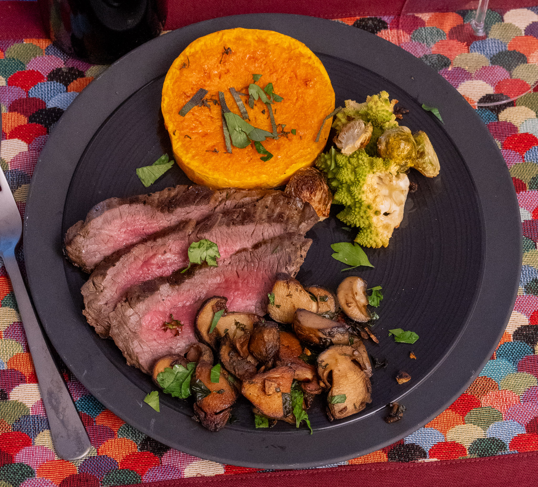 A bold, powerful wine with with 16.5% alcohol required a bit of thought in designing a pairing. Medium rare steak and mushrooms seemed to promise bold and earthy flavors. It’s currently cépes mushroom season in France and I know they are the same as Porcini mushrooms in Italy; a classic at the Italian table. I found a nice, simple recipe for Porcini mushrooms, Fungi Trifolati. Vegetables to accompany included a slice of roasted butternut squash and romanesco. Our surprise at the table was that the best match was the butternut squash, that rich body and savory/sweet taste matched the wine so nicely. Don’t forget vegetables as potential stars of your wine pairings!